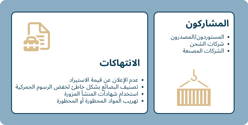 تشارك في مثل هذه المخالفات العديد من الجهات مثل شركات الاستيراد والتصدير، وشركات الشحن، بالإضافة إلى المصنعين. على سبيل المثال، قد تقوم إحدى الشركات بتقليل القيمة المُعلنة للبضائع لتقليل قيمة الرسوم الجمركية، أو قد تُصنف المنتجات بشكل غير صحيح لتجنب الالتزام بالقيود والضرائب.
